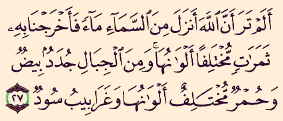“ أ لم تر أن الله أنزل من السماء ماء فأخرجنا به ثمرات مختلفا ألوانه و من الجبال جددٌ بيض و حمر مختلف ألوانها و غرابيب سود . و من الناس و الدواب و الأنعام مختلف ألوانه كذلك ، إنما يخشى الله من عباده العلماء إن الله عزيز غفور “ ( سورة فاطر – آيه 27 )